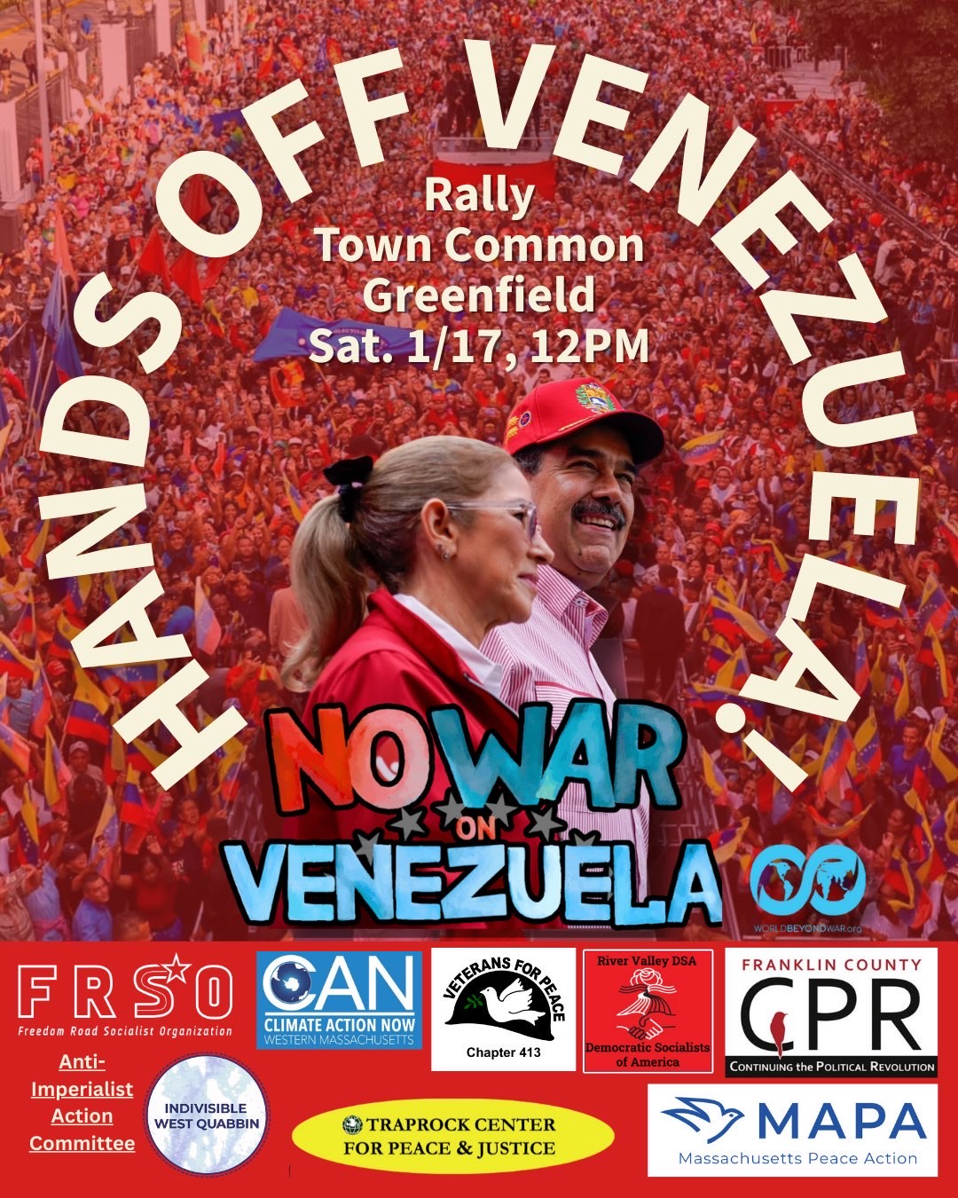 Join us for a Global Day of Action on Saturday, January 17 in solidarity with Venezuela sponsored by a number of local and statewide groups. We’ll be on the Greenfield Common from 12:00 Noon until 1:00 PM. We are calling for an end to U.S. hostility toward Venezuela, including sanctions, threats, and war. We also demand an end to the funding that allows such crimes and the release of Venezuela’s kidnapped President Maduro and Cilia Flores. U.S. pressure on Venezuela is escalating, risking another war for oil! We don’t need oil, we don’t want oil. We want more affordable housing, Medicare for All, union jobs, cheaper food and, of course, why not, the release of the Epstein files.