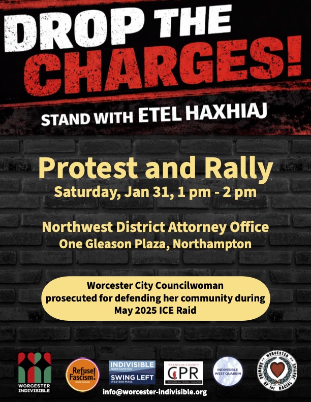 Sponsored by: Worcester Indivisible, Indivisible Northampton, Franklin County Continuing the Political Revolution, Indivisible West Quabbin, Standing Up for Racial Justice – Worcester, Refuse Fascism, and Independent Socialist Group